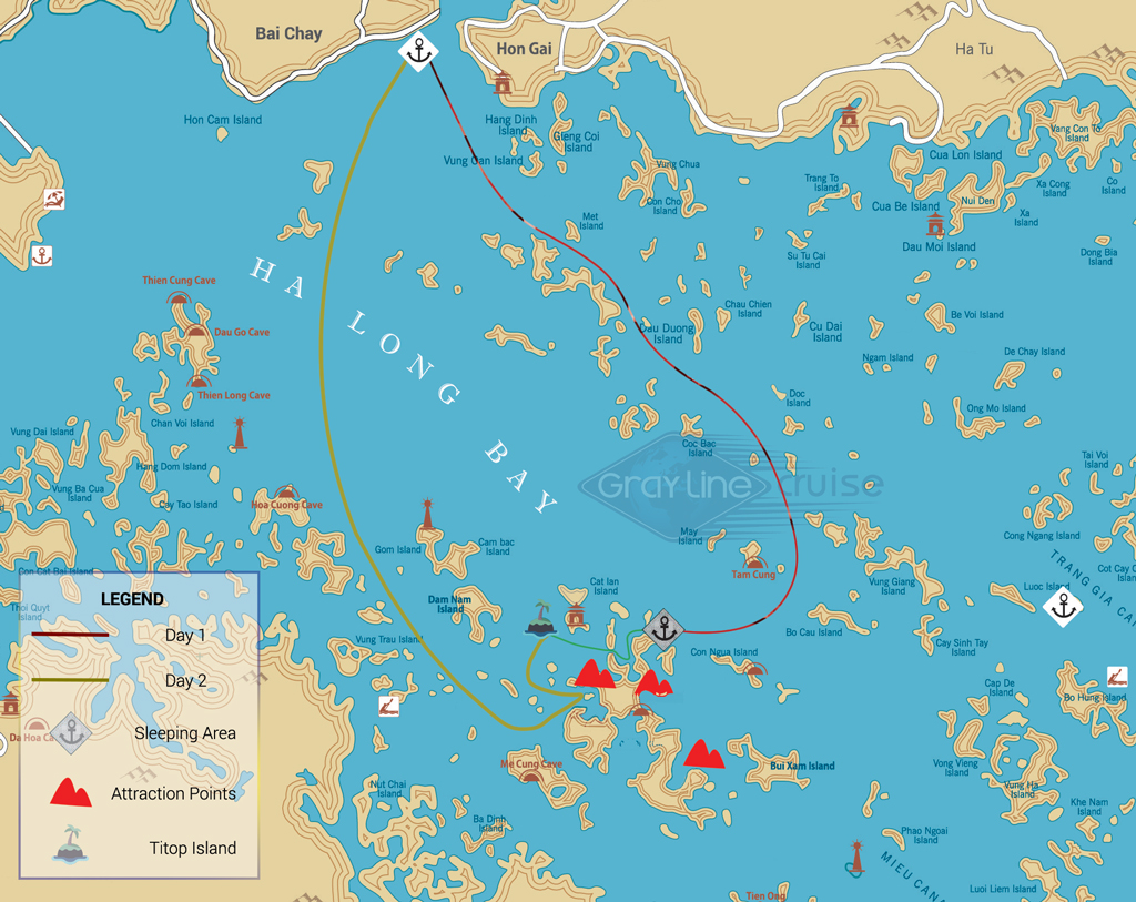 07:45 Tender boat will pick us up to visit the Surprising (Sung Sot) Cave, discovered in 1901, and now being a must-to-see tourist attraction for its extensive space. After the rock formation and millions years of water erosion, the cave is now featured by hundreds of marvelous stalactites, stalagmites and grandeur stone chambers which are incomparable with any cave in Gulf of Tonkin.